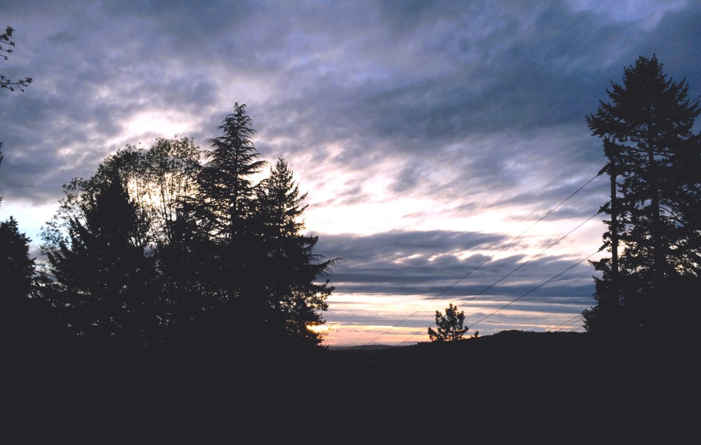 Tonight, gathering winds dancing tops of the firs, And the rain briefly stopped, but still A squall of clouds scuttle across the valley From the mountains, from the coast,