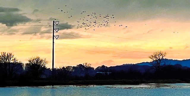 So, desolate, we determined, When the noon sun Burned away the morning fog, To pack a picnic lunch And seek solace in nature At a nearby refuge, Immersed in solitude In harsh autumn light, Glittering surface of pintail marsh, A thousand geese take flight as one A cacophonous honking roar, Dozens of swans and hundreds of ducks Unperturbed by the ruckus, Continue preening and dabbling, Harrier hawks prowling the fields, A half-dozen bald eagles Sullenly surveilling the ponds below, From barren cottonwoods And poles along the railroad tracks Stretched out across the lowland.