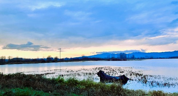 A few of the now-scattered geese drift back To the marsh in ragged formation. A box turtle basks on a downed black branch Jutting from the surface. Ringnecks and pintails feeding, White swans preening on the shore Strike sculptural forms, bent necks and spread wings, And sun sinks down toward the coastal range, Mary’s Peak obscured in mountain mist behind us.